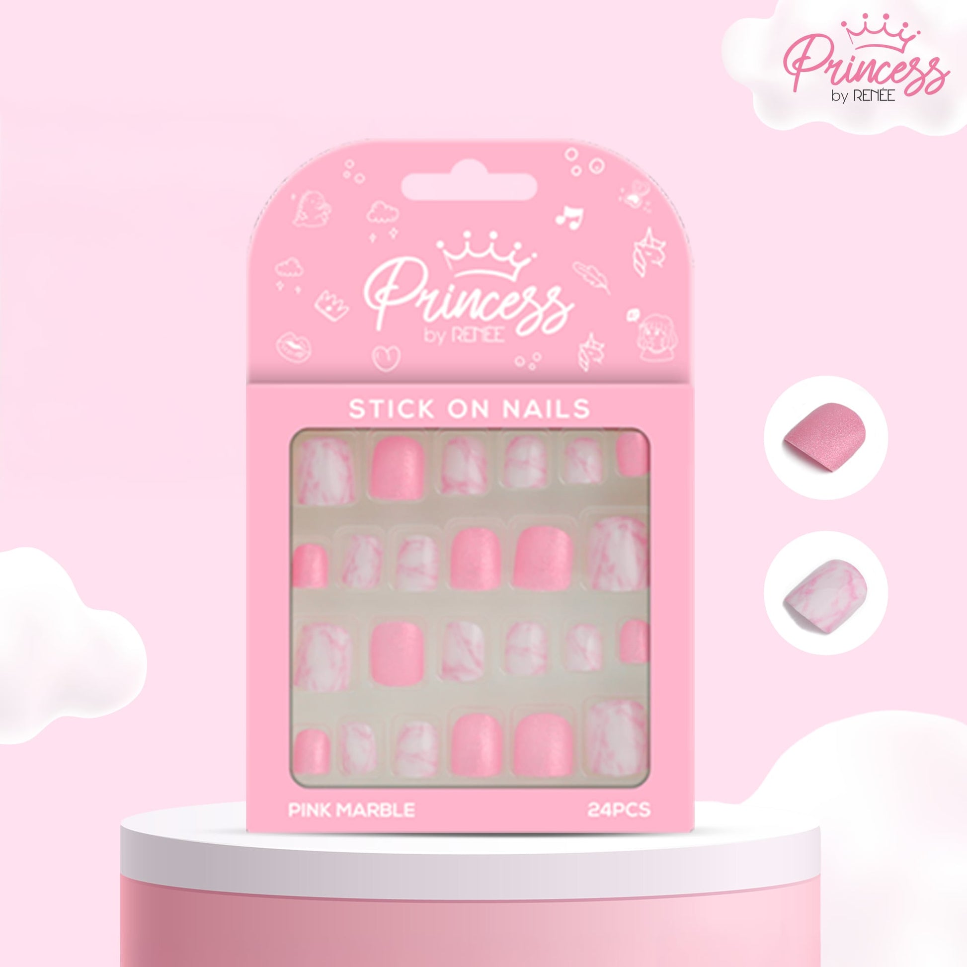 2) Princess by RENEE Stick On Nails: Pink Marble: There isn't a better way to cast magic spells with majestic Stick on nails from Princess by RENEE! Available in beautiful tones of pink, these nails are pre-glued, super easy-to-use, long-lasting and reusable! This pack of stick on nails includes 24 pre-glued nails of different sizes to fit all, 1 cleaning pad with 1 Manicure Stick.