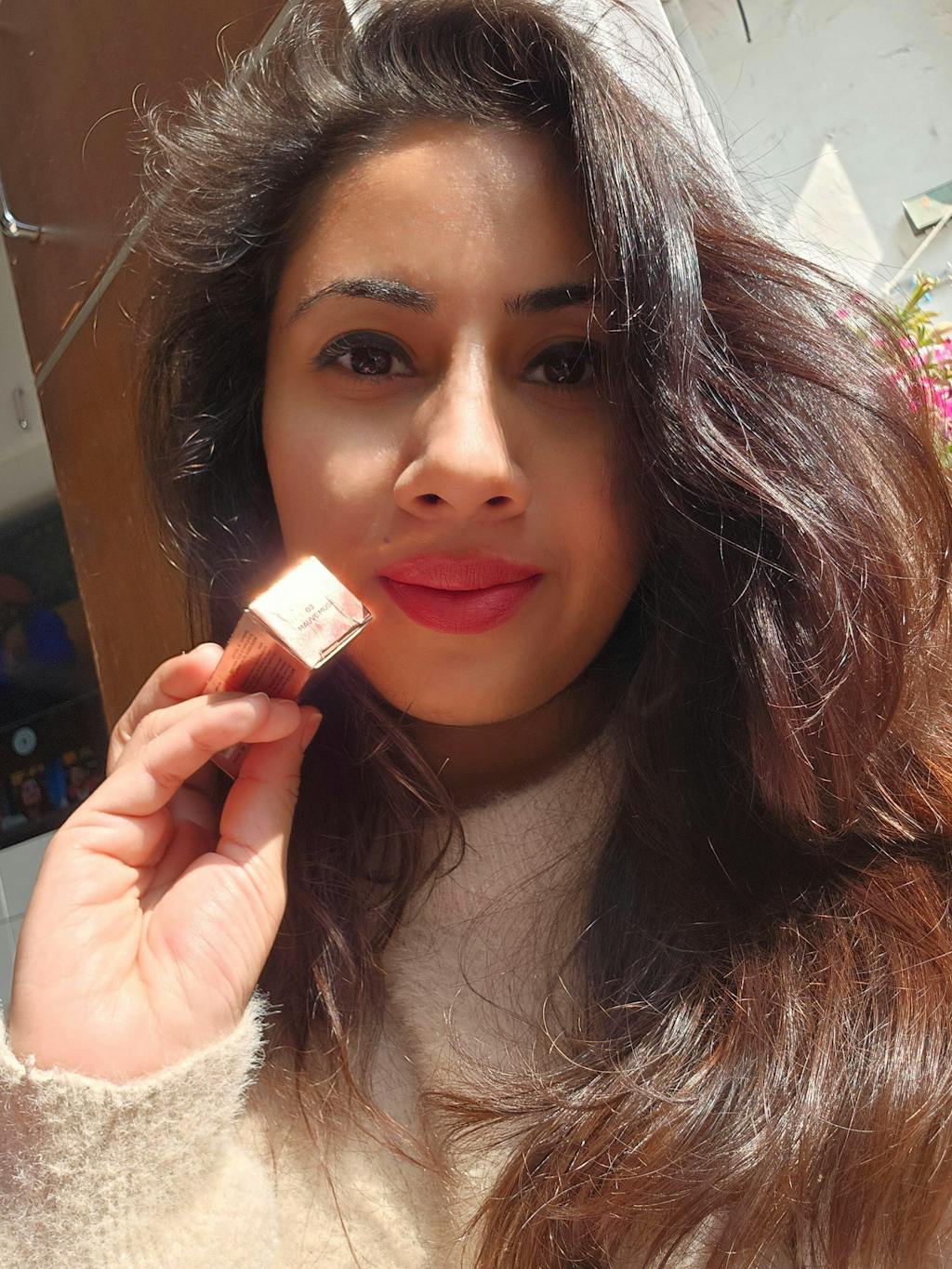 Start applying from the center of the upper lip moving outward along the lip line, repeat the same for lower lip. Purse the lips together & you are ready to go!