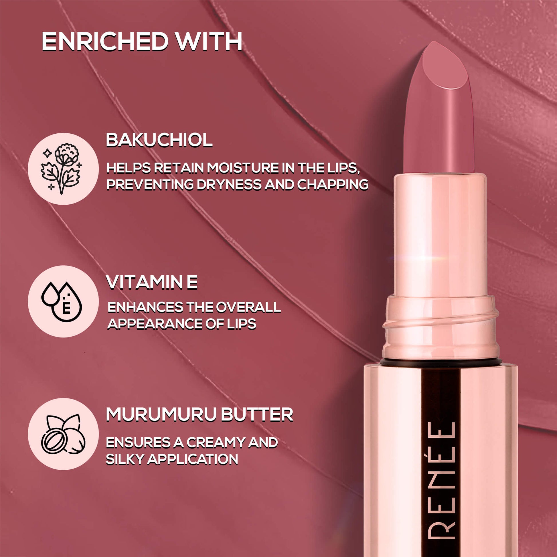 Show-off your perfect pouty lips with RENEE Everstay Long Stay Matte Lipstick. Enriched with Bakuchiol, Murumuru butter & Vitamin E, this lipstick is all your lips would desire for! Wear the shade you love & sip your favourite drink absolutely worry free. This long-lasting, pocket friendly matte lipstick is your ready-to-go essential for work, casual parties or sundowners. Available in six gorgeous shades, this hydrating and nourishing lipstick is all set to level up your glam game.