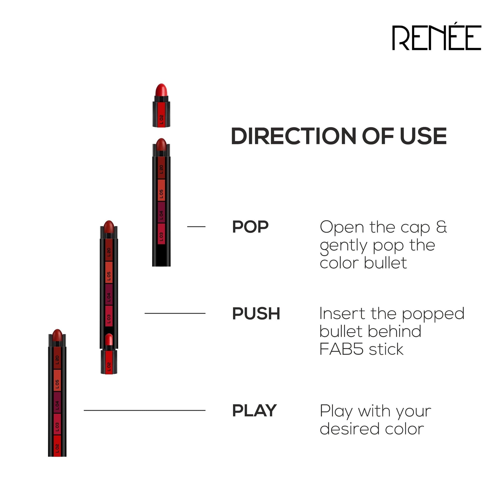 Open the cap of FAB 5, 5 in 1 lipstick and gently pop the color bullet and push it in the bottom of the stick, play with the desired color. Start the application from the centre moving towards outwards of lips, just one stroke and you are ready to go.