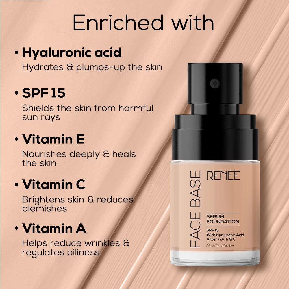 RENEE Face Base Serum Foundation is sure to be your skin's new best friend! With SPF 15 protection, it combines velvety touch of a luxurious foundation with the nurturing embrace of an all-in-one serum. While Hyaluronic acid hydrates and plumps your skin, essential Vitamin C brightens the skin & reduces blemishes, Vitamin A smoothens the skin & Vitamin E nourishes the skin deeply and heals it. Its ultralight and nourishing formula glides as smoothly as a ballerina on ice, leaving you with a sheer coverage and a dewy glow.