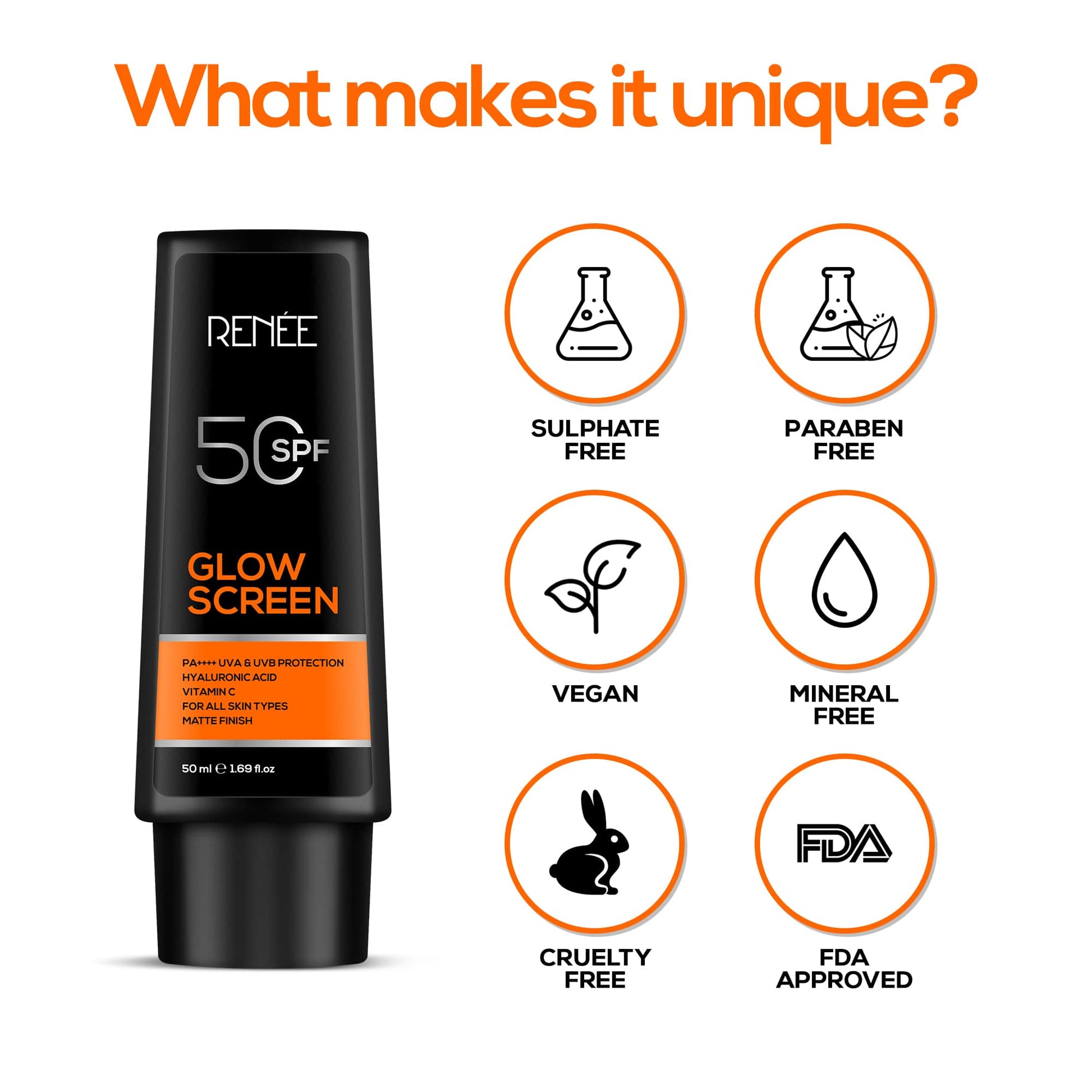 Presenting RENEE Glowscreen SPF50 Sunscreen, a perfect sunscreen for those who want both sun protection with a natural and matte finish. Formulated with SPF 50 and broad spectrum to give your skin all-round protection, this sunscreen is infused with the goodness of Aloe vera, Hyaluronic acid, Vitamin C and Niacinamide providing your skin ultimate nourishment. RENEE Glowscreen SPF 50 Sunscreen is gentle enough for daily use and won't clog pores or leave a white cast. Its moisturizing formula blends seamlessly into your skin, leaving behind a smooth, even and subtle matte finish that looks and feels natural.