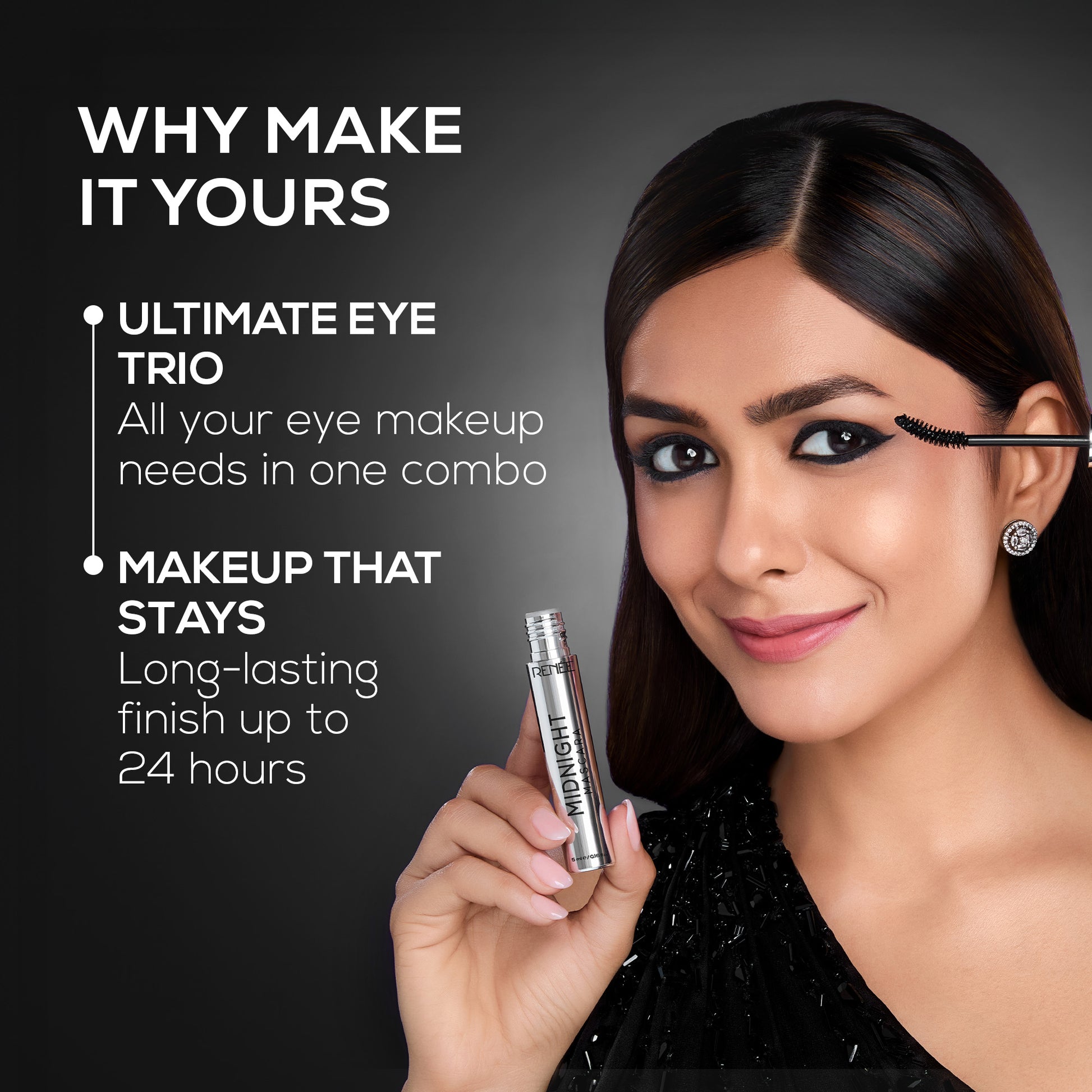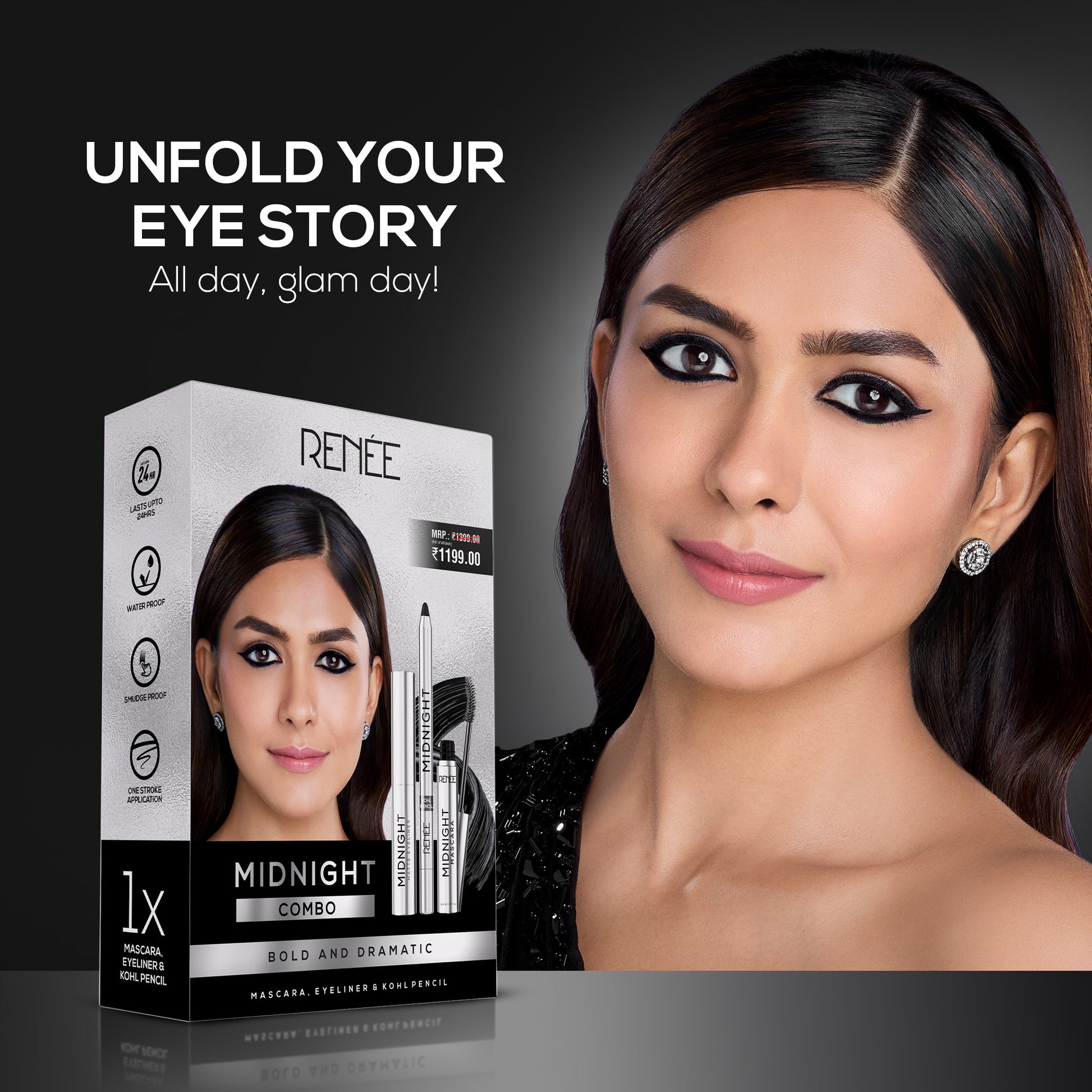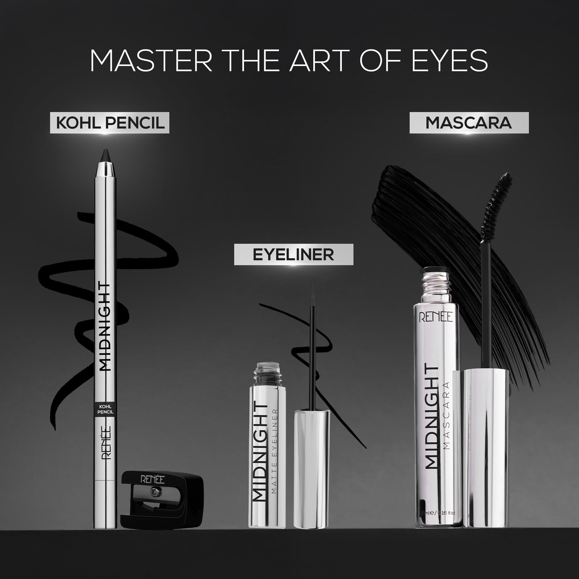 Redefine your eyes with RENEE Midnight Combo. Whether you want to wing it or go smokey, Midnight Kohl Pencil gives your eyes that instant diva vibe. To add some more glitz and glam, Midnight Eyeliner delivers intense colour pay-off that cannot go unnoticed. To power up the lashes, Midnight Mascara is your secret guide. This curvy wand adds bold volume and intense length for the flawless, stunning eyes. RENEE Midnight Combo-for the eyes that create a never-ending drama!