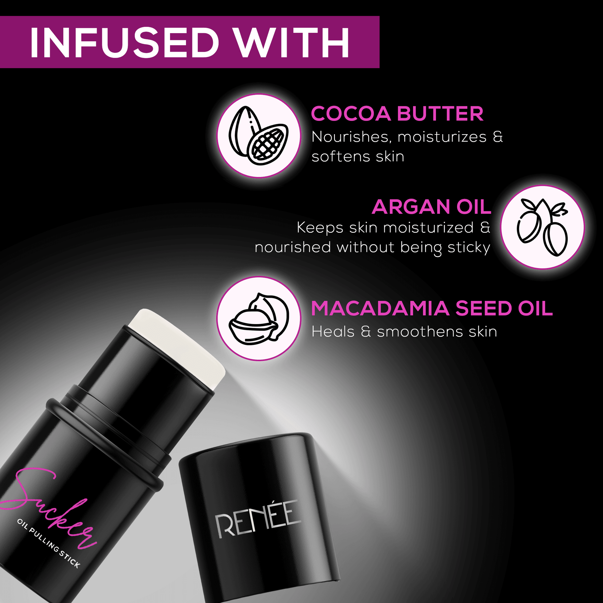 RENEE Sucker Oil Pulling stick, an innovative solution for achieving an oil-free and matte finish. Designed to combat shine and provide a smooth, non-greasy appearance, this product is your secret for flawlessly matte skin on the go. With just a simple swipe, RENEE Sucker Oil Pulling Stick's specially formulated stick with argan oil & cocoa butter mattifies your skin, leaving it fresh and free from excess sebum. Gone are the days of worrying about midday touch-ups or carrying blotting papers everywhere you go. RENEE Sucker stick is here to ensure you're always selfie-ready with a truly velvety-smooth and matte face. Its unique formula and convenient stick format make it a witty little miracle worker that allows your skin to shine in all the right ways. So go ahead, indulge in RENEE Sucker Oil Pulling stick and let it help you conquer the day with confidence!